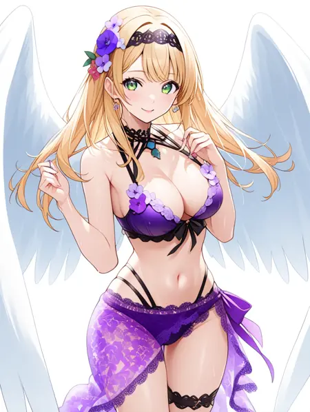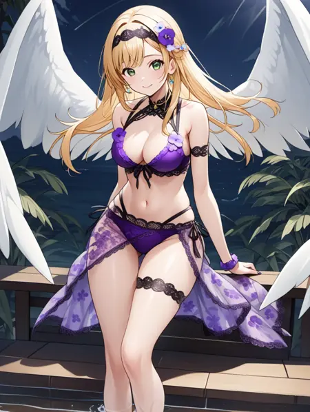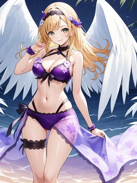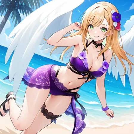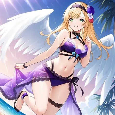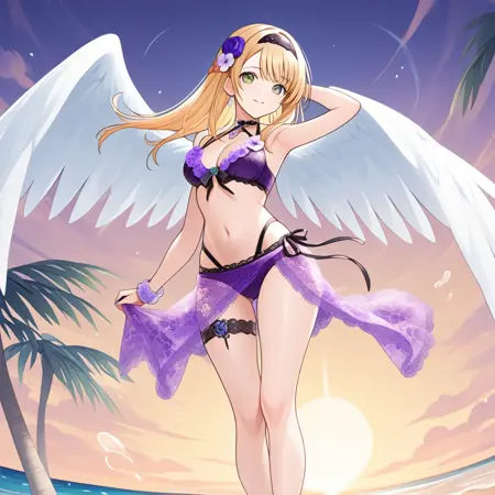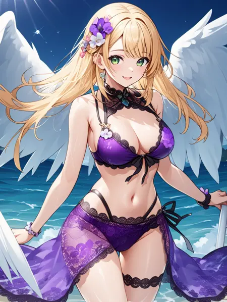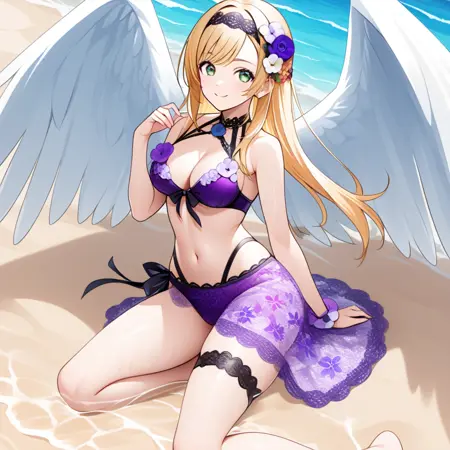 프롬프트 예시: natu,블론드 헤어,헤어 장식,긴 헤어,녹색 눈,보라색 비키니,레이스 트림,허벅지 스트랩,레이스 짧은 사롱,천사 날개,바다,해변,
