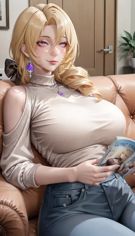 cocoliarand, purple eyes, blonde hair, long hair, drill hair, hair ribbon, jewelry, single earring, white glove, single glove, long sleeves, white dress, shoulder cutout, hip vent, thigh boots, black footwear,
