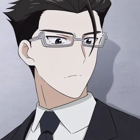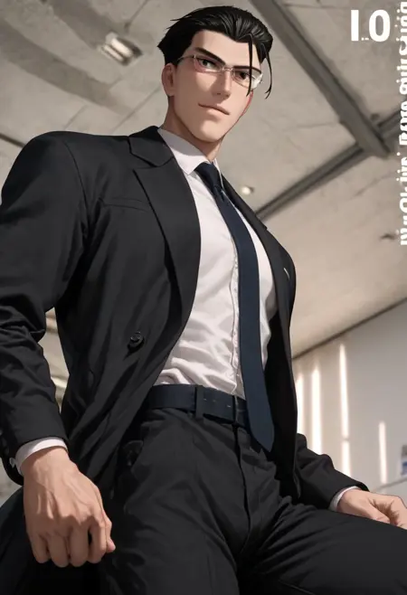 1boy, solo, male focus, toned male, Jinguuji, Tsukasa_Jinguuji, Black hair, One strand hair on forehead, black eyes, Pale skin, white glasses, black tuxedo, white shirt, tie, long sleeved, black pants
