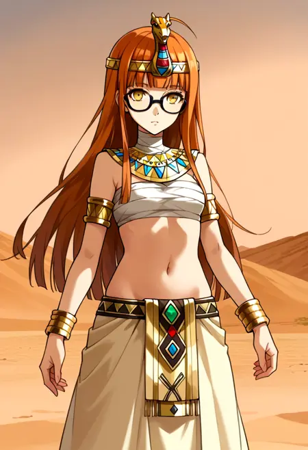 p5futaba-cognitive, 黄色眼睛, 饰品, 脐部, 露腹, 腹布, 臂环, 裙子, 绷带, 手镯, 长裙, 埃及服饰, 埃及风格, 乌塞赫项圈, 头饰, 绷带胸部, 骨盆帘, 裸露肩膀, 头饰
