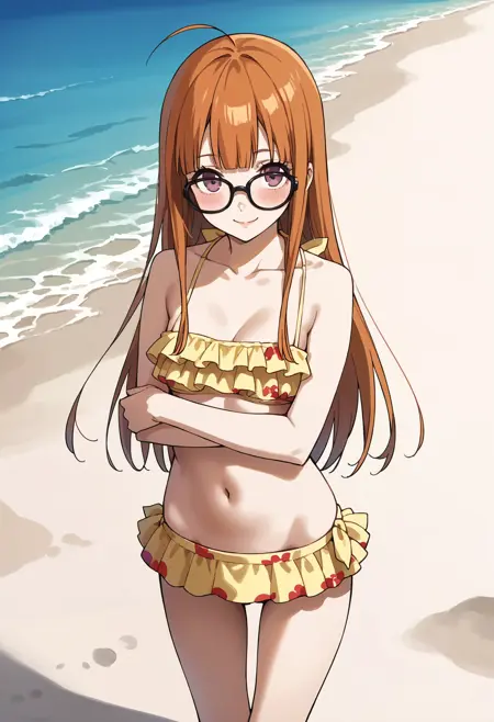 p5futaba-swim, 泳装, 荷叶边比基尼, 黄色比基尼, 红色图案, 比基尼裙
