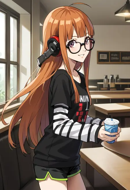 p5futaba-lounge, 黑色衬衫, 条纹袖子, 脑后耳机, jlmk!, 黑色短裤, 超短裤