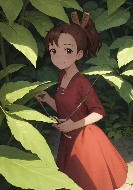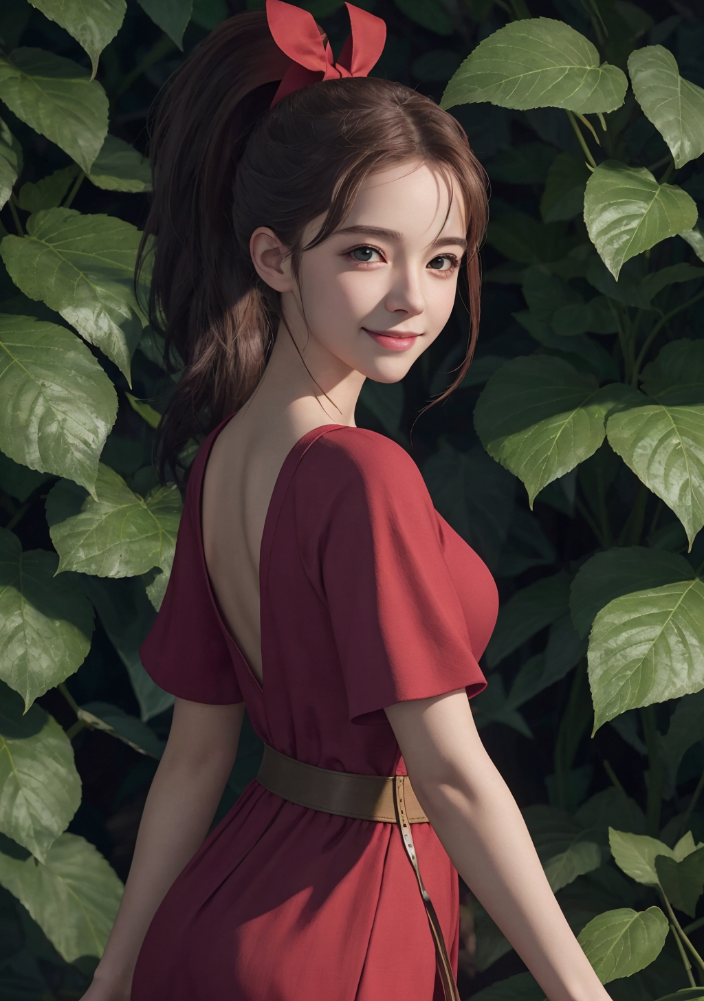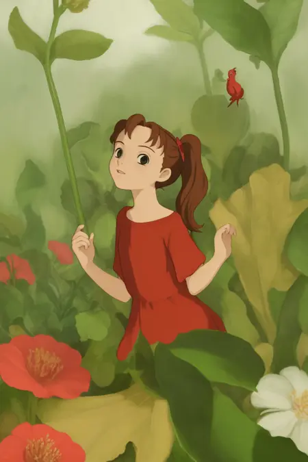 arrietty, brown hair, tall, high ponytail, ponytail, red dress, black eyes, minigirl,