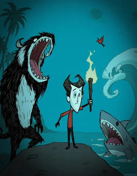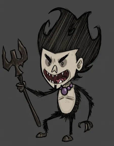 デジタル插画:黒い尖った髪を持つウィルソン。炎を上げた松明を手に持ち、赤い縞模様のベストと黒いズボンを着用。対向には赤い目と歯を持つ黒い蜘蛛がおり、背景は落ち着いた緑色。don't starveのスタイルで描かれたもの