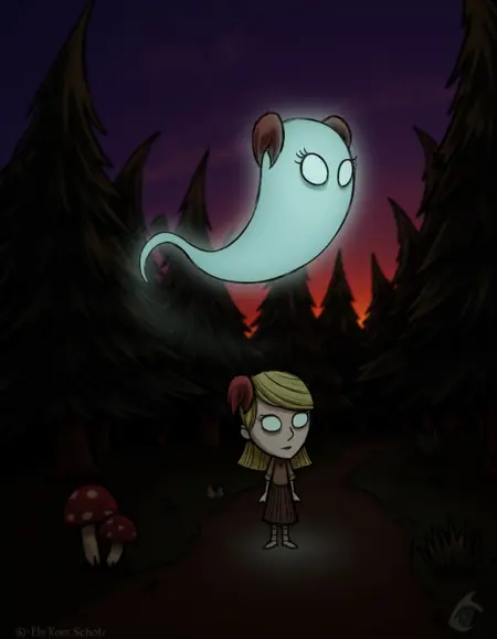 頭に赤いリボンを結んだ少女ウェンディの絵。don't starveのスタイルで描かれたもの