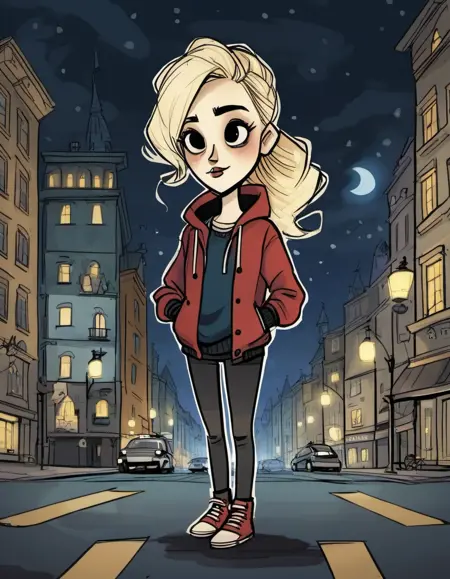 顔の前にナイフと髪を掲げ、ピンクのマスクを着用したカートゥーンキャラクターの絵。don't starveのスタイルで描かれたもの