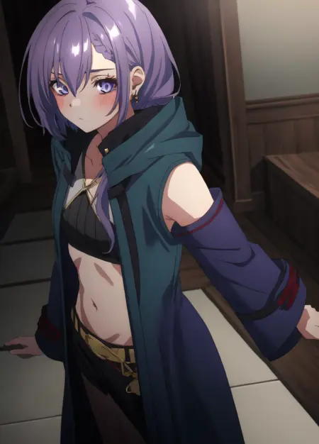기본 프롬프트: Luna, solo, 1girl, belt, black shorts, blue eyes, blush, coat, detached sleeves, hand on hip, indoors, jewelry, midriff, navel, purple hair, short shorts, shorts,