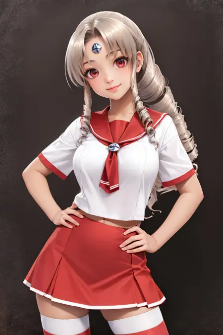 기본 복장: school uniform, serafuku, red skirt, striped thighhighs