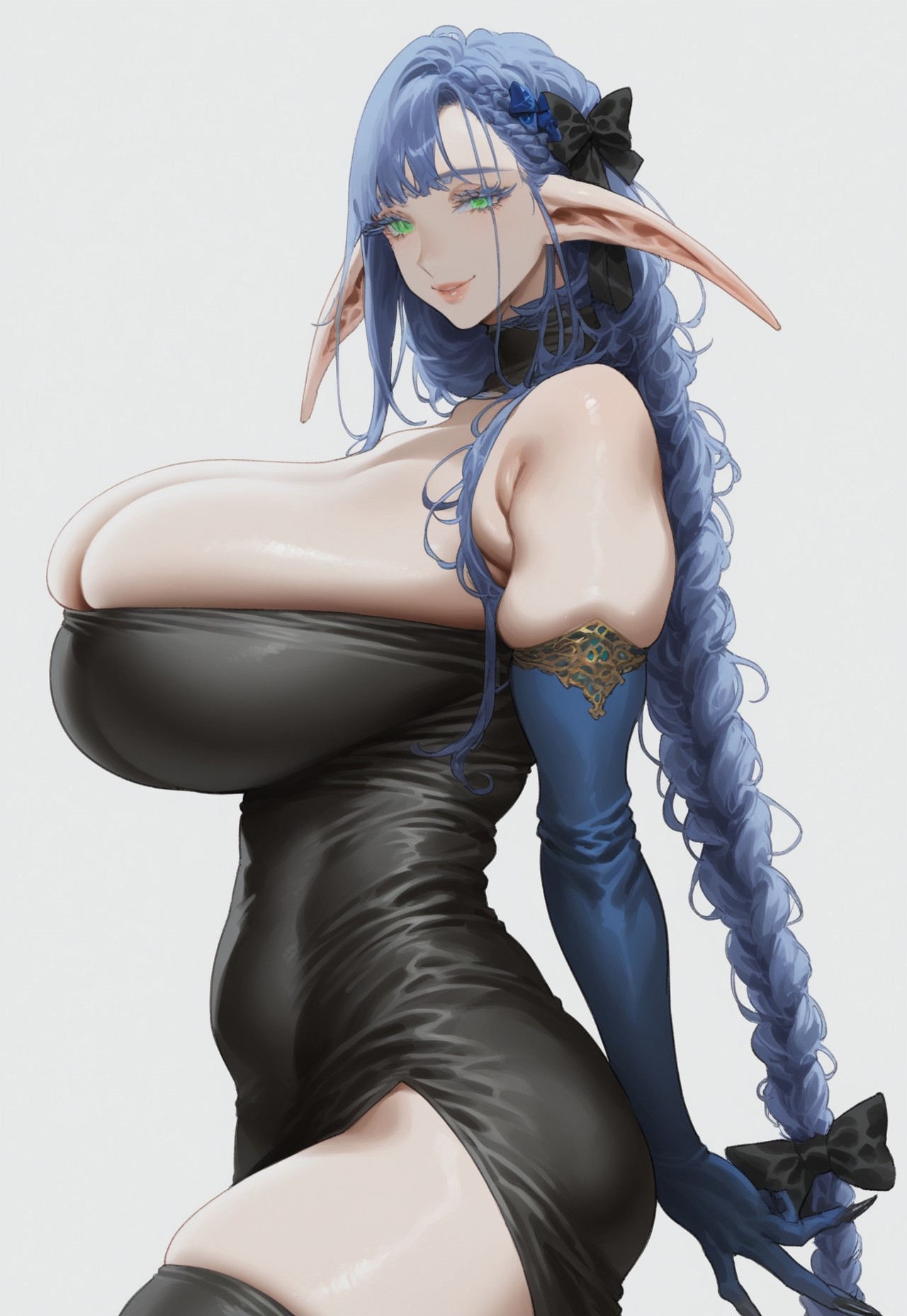 1girl, elf, milf, green eyes, long eyelashes, very dark blue hair, very long hair, blunt bangs, elf ears, long ears, massive breasts, wide hips, pale skin, black nails, long nails, ((colored skin:1.1)), ((grey body:1.3))