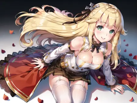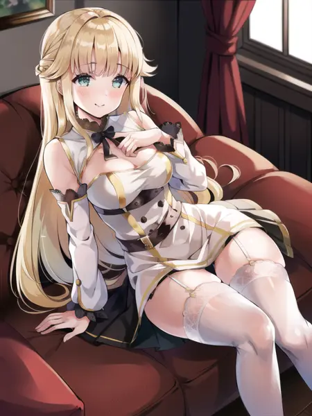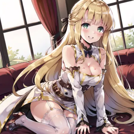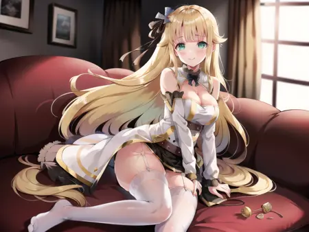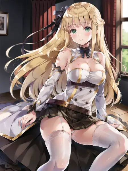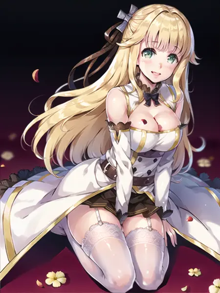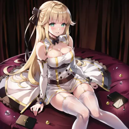 urora,blonde hair, long hair, hair ornament, green eyes, white dress, sleeveless, armguards, white thighhighs, garter straps, miniskirt,