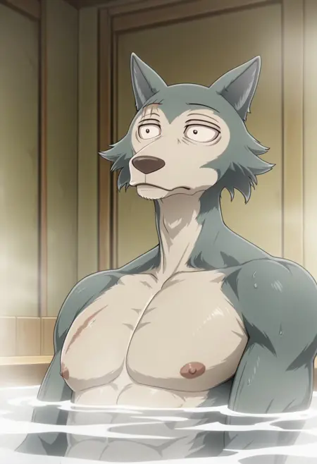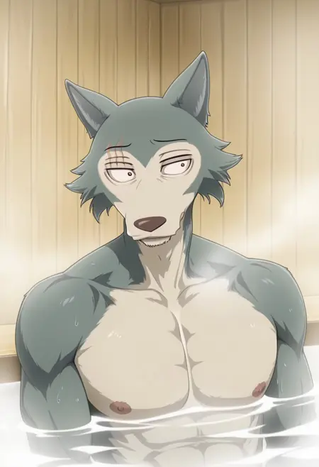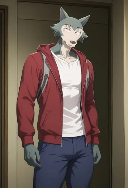 Legoshi, anthro, wolf, beastars, scar on right brow, mature male, animal ears, grayish blue fur, brown eyes, athletic build