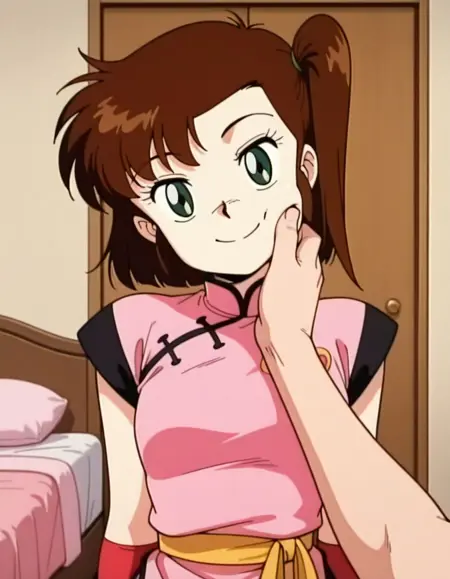 Prompts: lora:Yan0:1, Yan0, 1girl, short hair, brown hair, green eyes, pink china dress, 1980s \(style\),