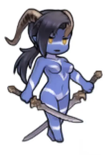 デフォルトの外見: シベル、黒髪、低めのポニーテール、長い髪、非対称な髪型、角、青い肌、白い体の模様、白い顔の模様、黄色い目、黄色い白目、黒い唇、尖った耳、モンスター娘、裸、中程度の胸、乳首なし