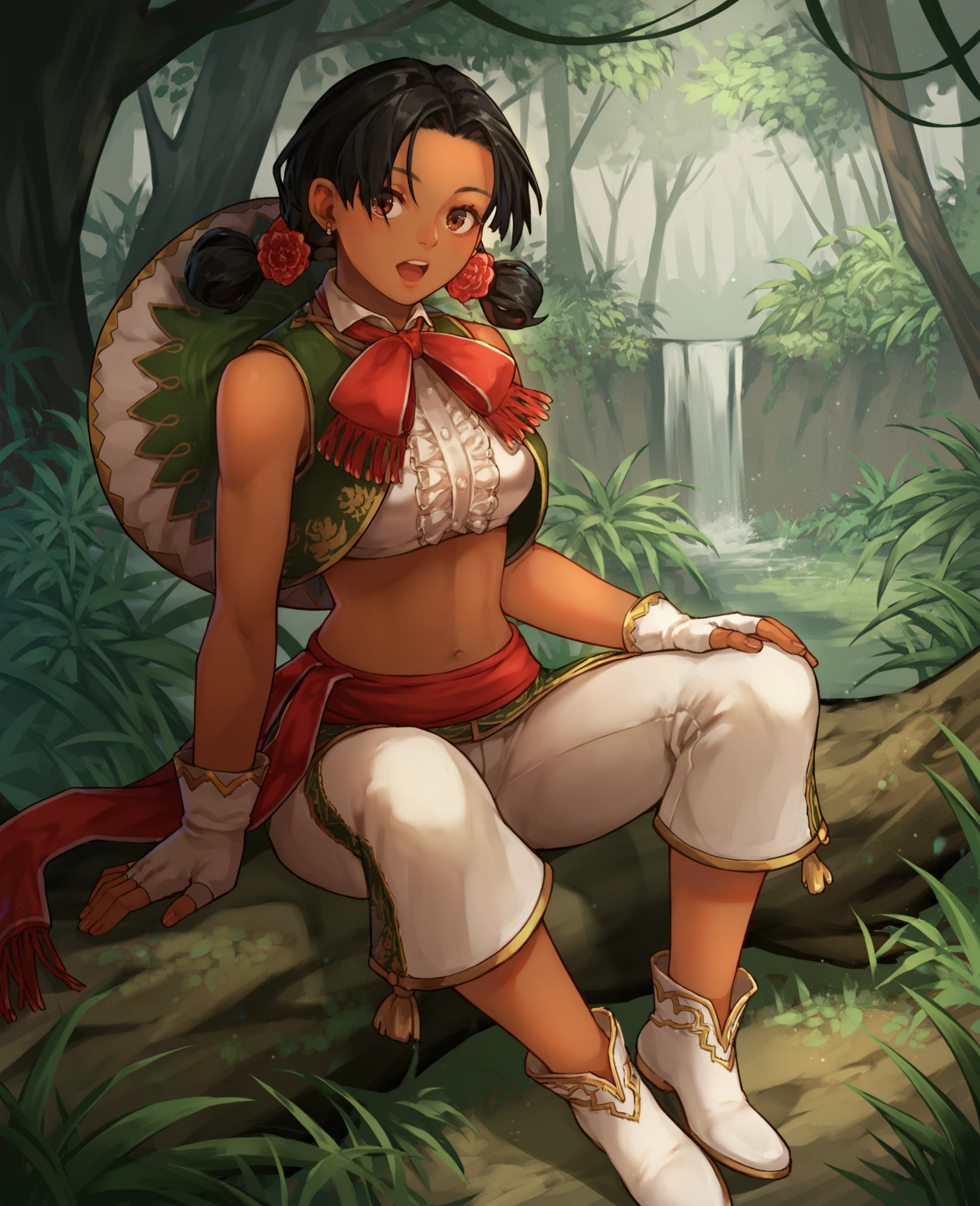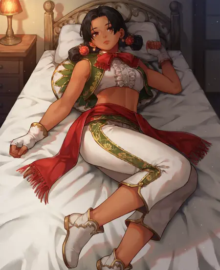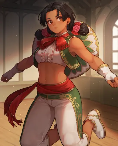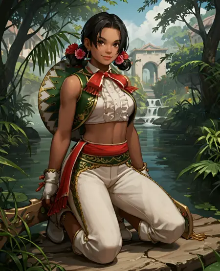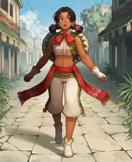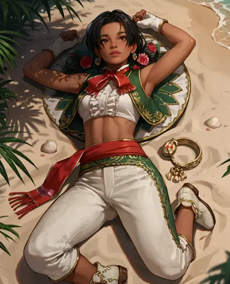 服装: 发饰,无袖,绿色马甲,白色短上衣,露脐,白色长裤,珠宝,流苏边饰,耳环,露指手套,白色鞋子,红色腰带