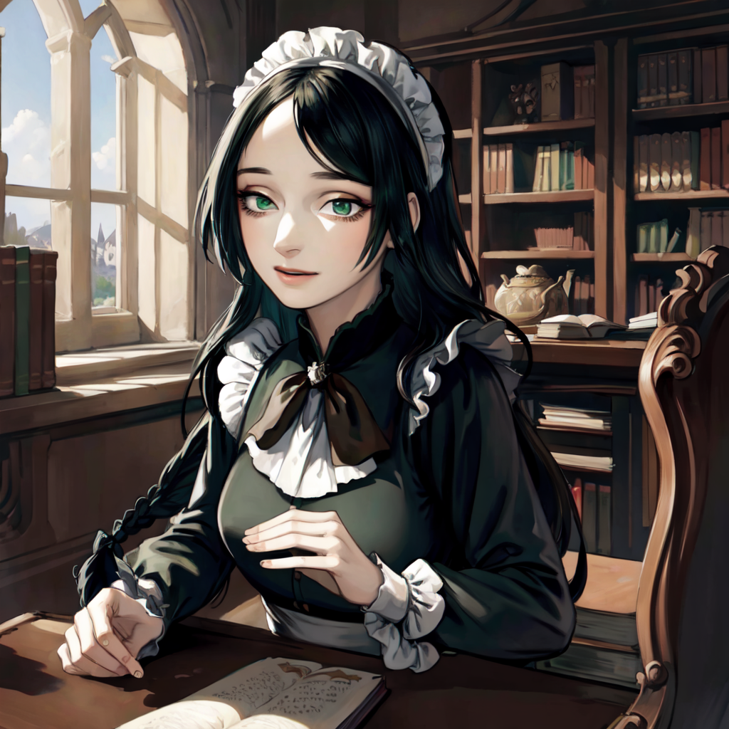 1girl, solo, long hair, maid outfit, green eyes