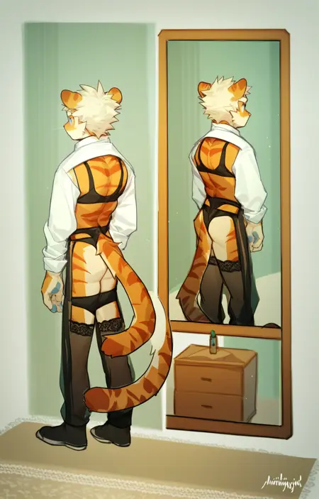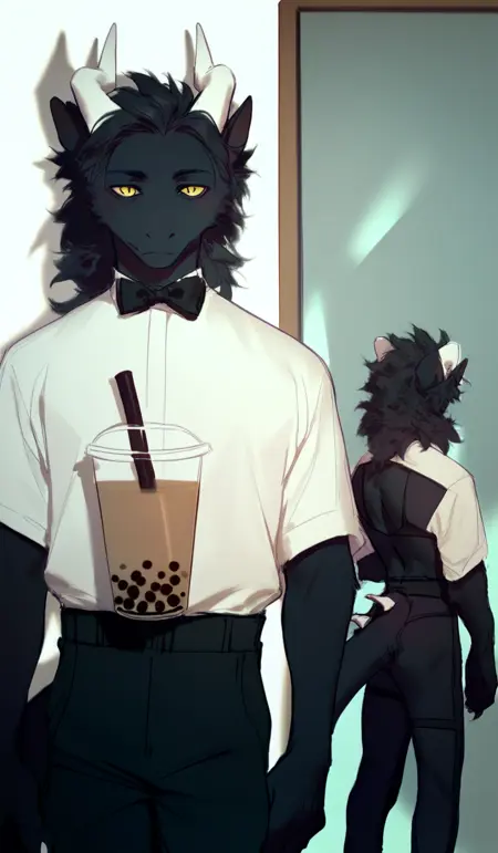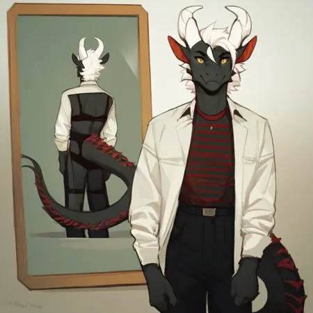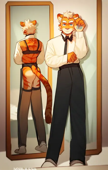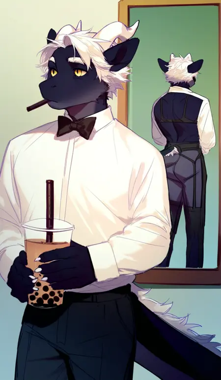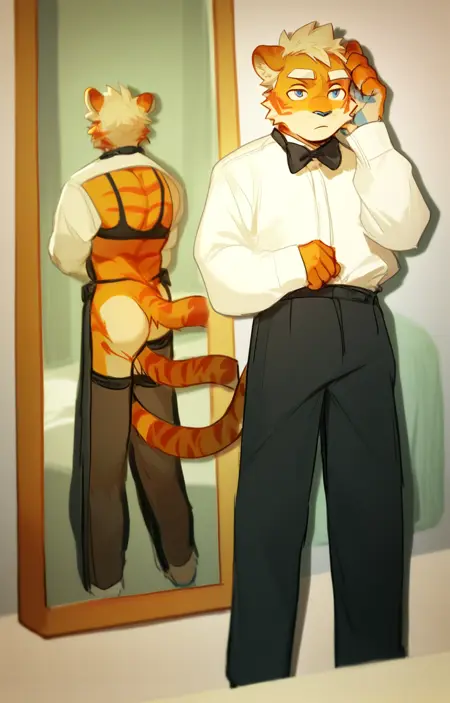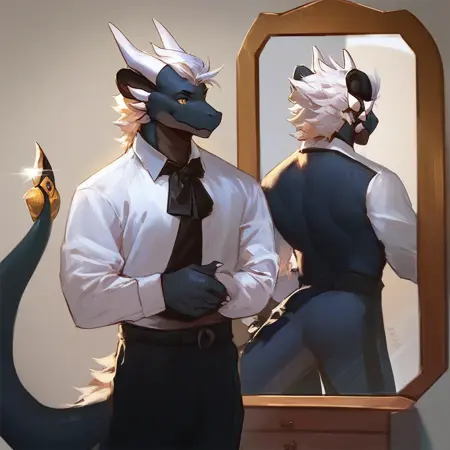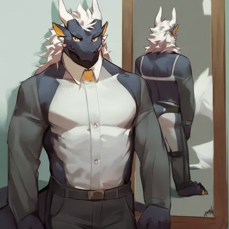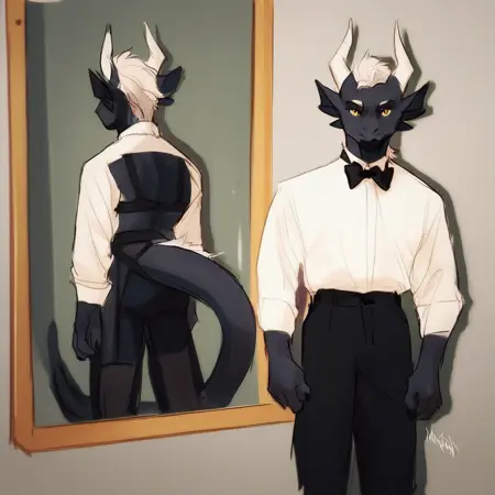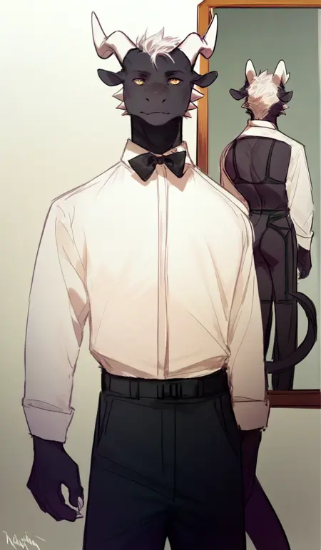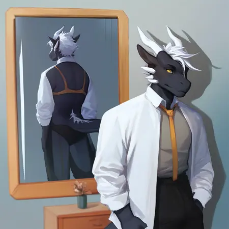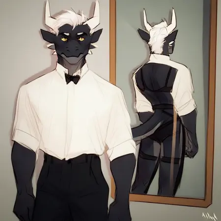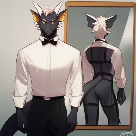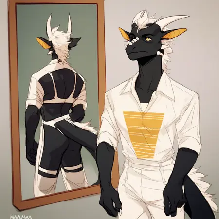 mikus-concept, standing, mirror, front and back, front, back, white shirt, black pants