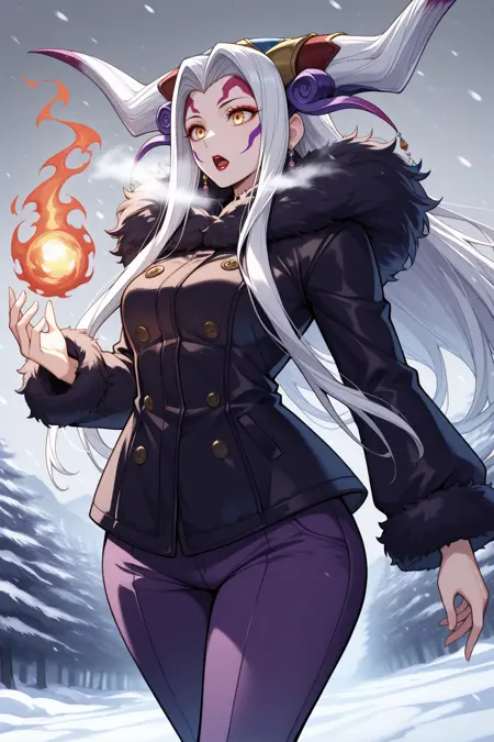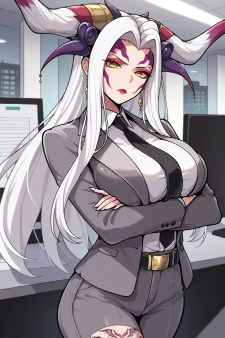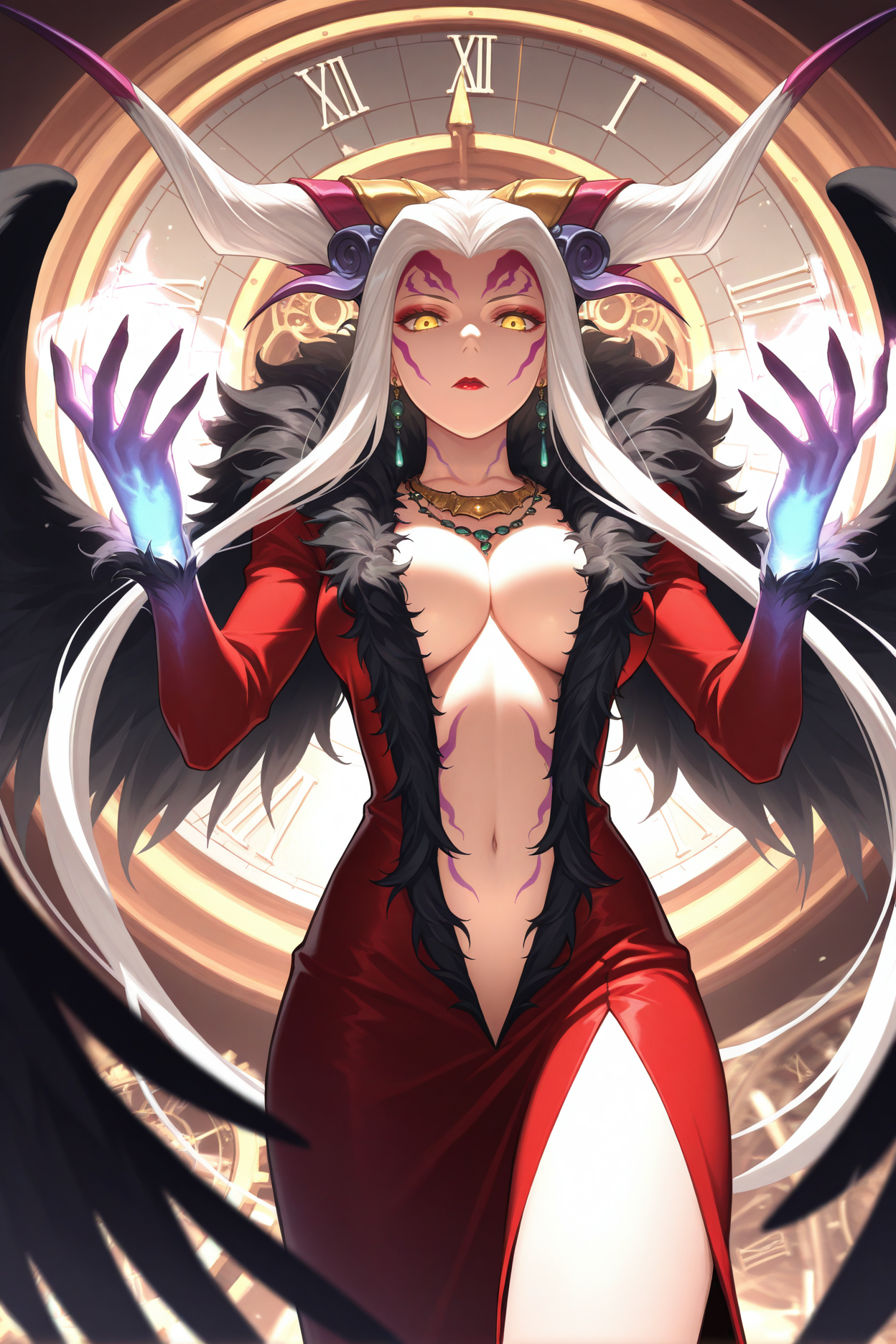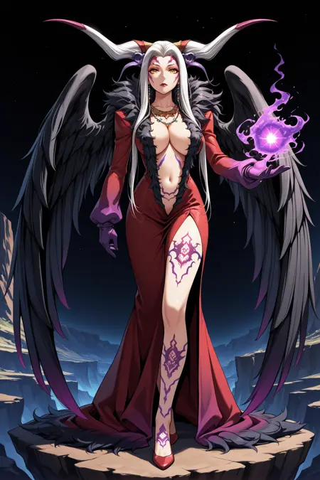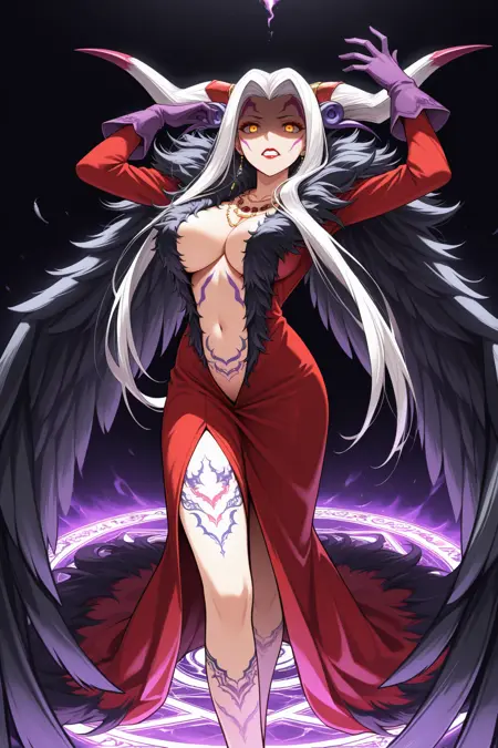 彼女の典型的な外見には、「イヤリング、ネックレス、羽のフリンジ、赤いドレス、サイドスリット、毛皮のフリンジ、深く開いた襟、胸元、おへそ、長いドレス、黒い翼、大きな胸、脚のタトゥー」を追加してください。