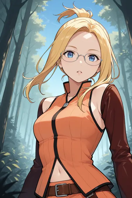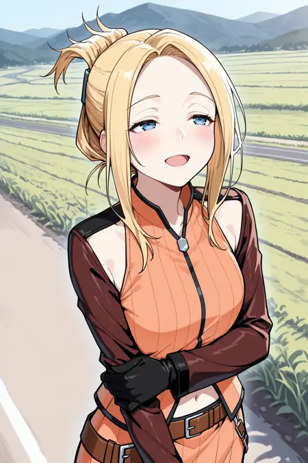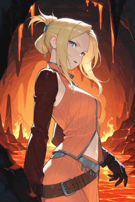 添加 "可脱卸袖子、橙色衬衫、无袖上衣、肚脐、橙色裙子、棕色腰带、手套、黑色靴子" 以呈现她的日常造型。
