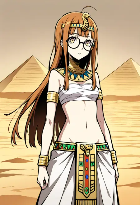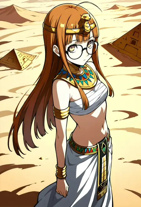 p5futaba-cognitive, 黄色い目, ジュエリー, へそ, 腹部, さらし, アームレット, スカート, バンデージ, ブレスレット, 長いスカート, エジプト風の服, エジプト, ウセクネックレス, カチューシャ, バンデージで覆われた胸部, 骨盤カーテン, 肩を露出, カチューシャ
