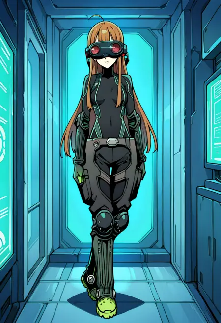 p5futaba-oracle, 黒のボディスーツ, ヘッドマウントディスプレイ, ゴーグル, 手袋, 緑の手袋, ベルト, 膝パッド, 緑の靴, ネオンのトリム