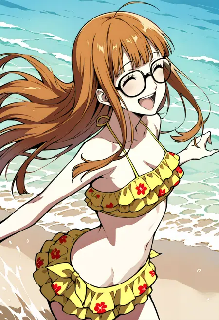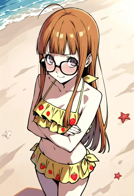 p5futaba-swim, 小さな胸, 水着, フリル付きビキニ, 黄色のビキニ, ビキニスカート, 赤いイチゴ柄