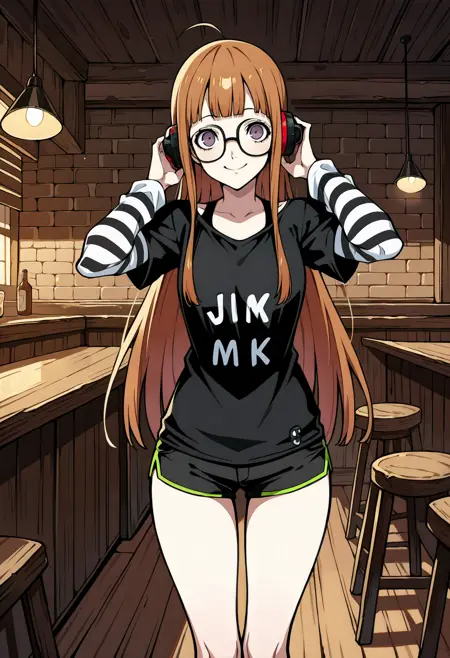 p5futaba-lounge, 黒のシャツ, 縞模様の袖, 頭の後ろのヘッドホン, jlmk!, 黒のショートパンツ, 短いショートパンツ
