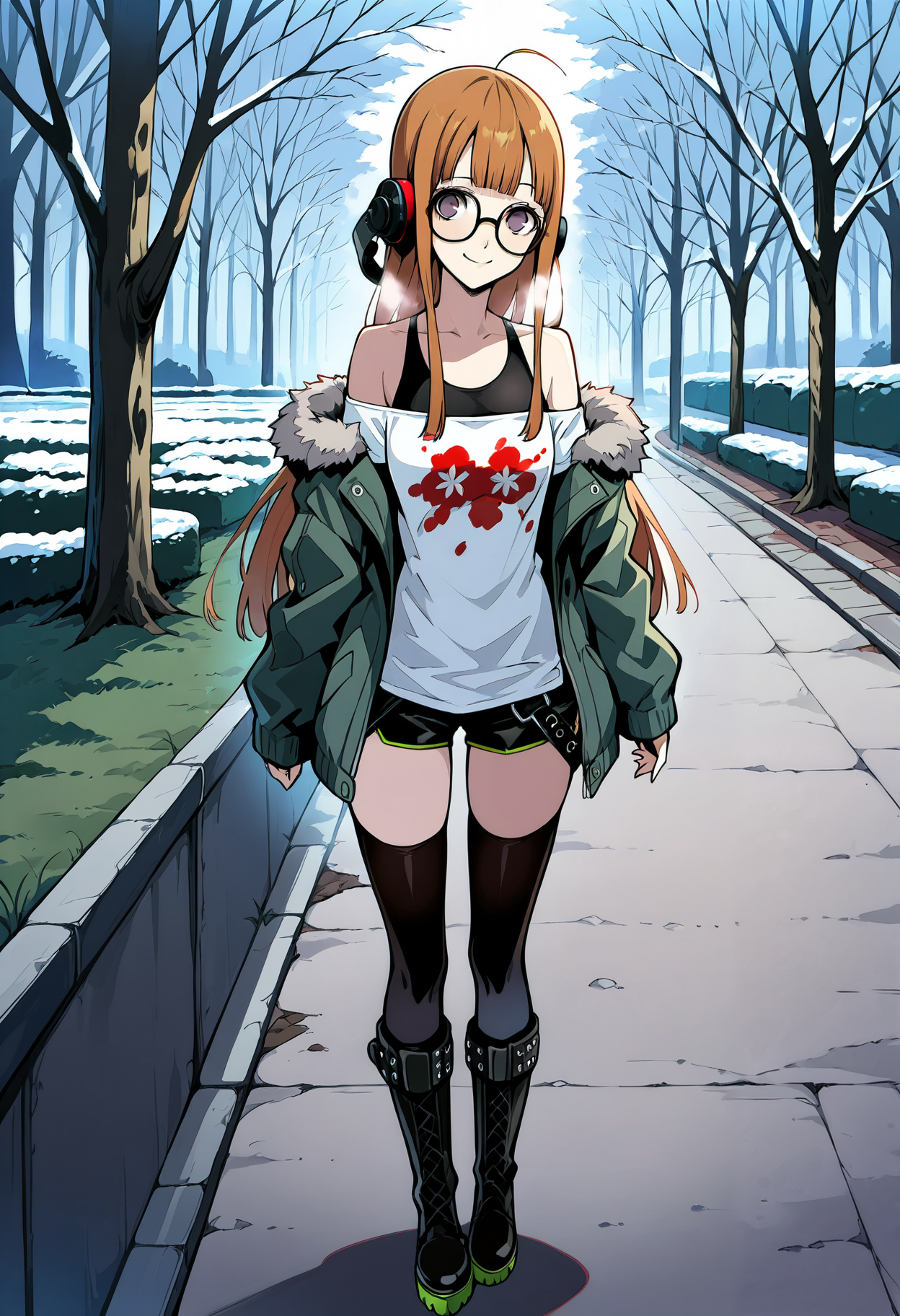 p5-futaba-winter, 頭の後ろのヘッドホン, ファー縁取りのジャケット, 緑のジャケット, シャツ, タンクトップ, 肩出し, 肩を露出, 黒のショートパンツ, 黒のタイツ, ブーツ, ネイビーブーツ