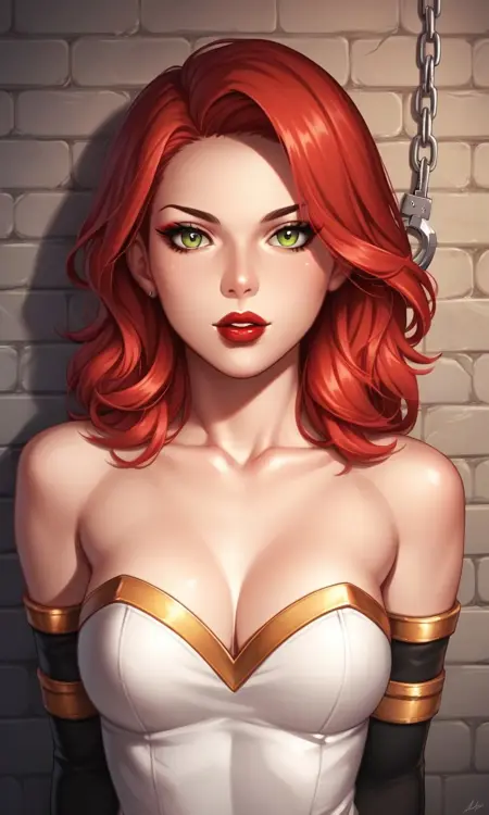 1woman, red hair, green eyes, yellow bodysuit, red gloves, red eyemask, domino mask
