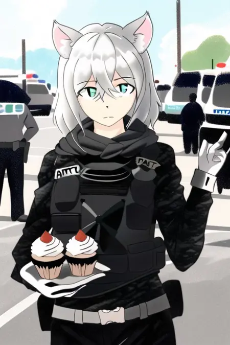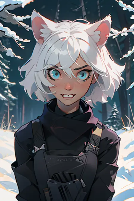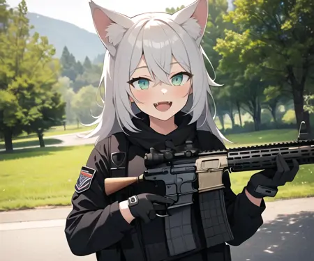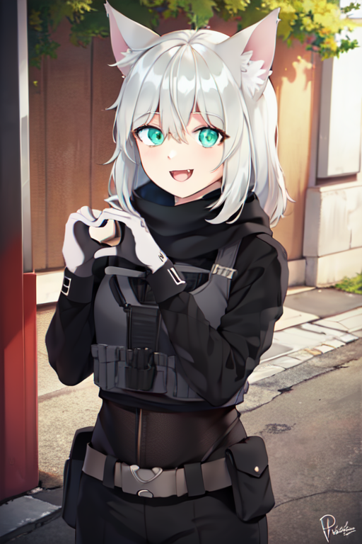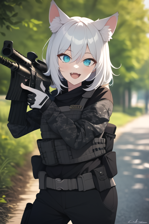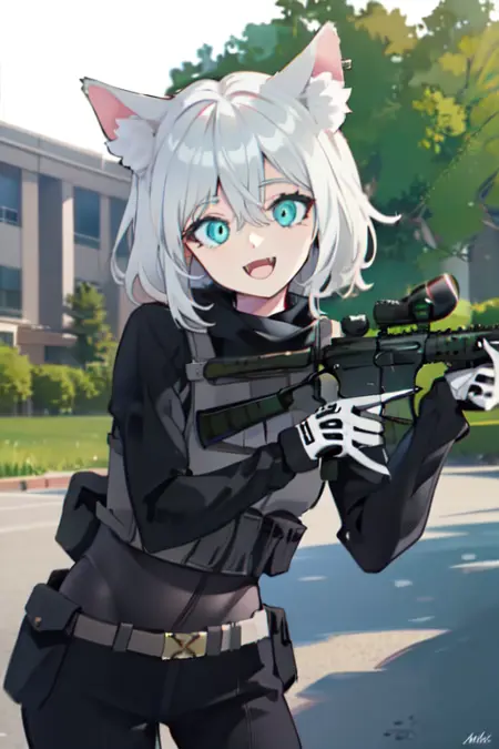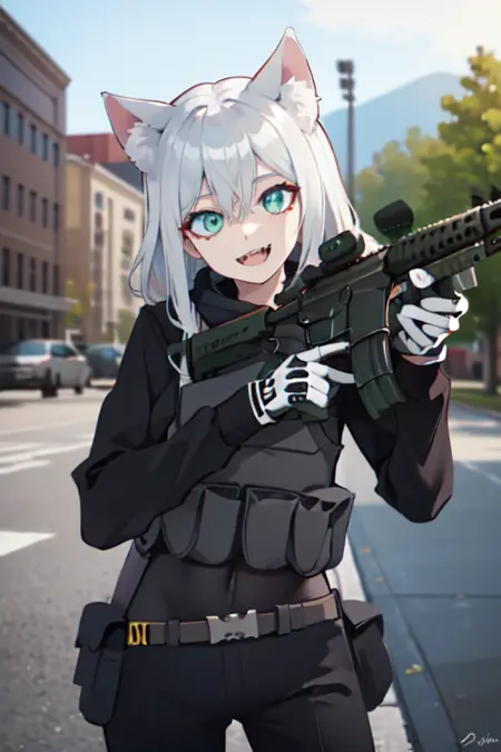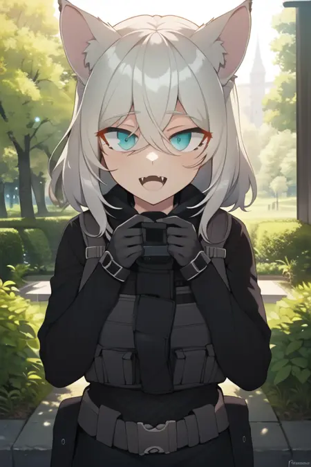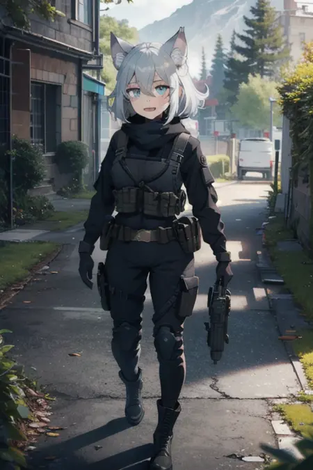 灰发,蓝眼睛,动物耳朵,狼少女,军事,黑色手套,战术装备,任何与军事相关的提示