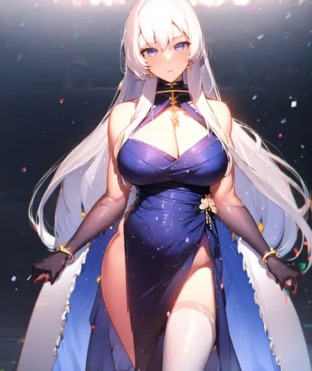 어두운 파란색 드레스, 긴 드레스, 헬터 드레스, 가슴 노출, 팔꿈치 장갑, 어두운 파란색 장갑