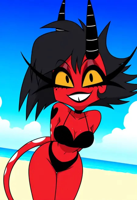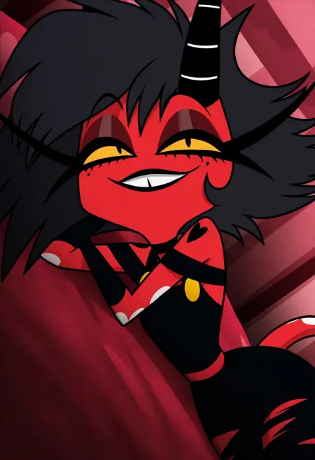 ミリー \(helluva boss\)、ミリー、黒髪、ショートヘア、赤い肌、黄色の白目、縦に細長い瞳孔、角、悪魔の尾