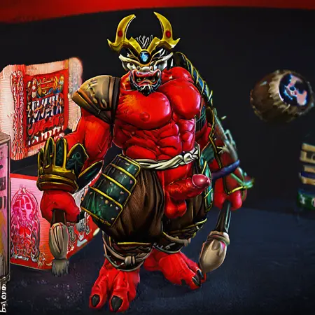 雷神、闪电之神、红皮肤、肌肉发达、两根手指、一根拇指、两个脚趾、黑色指甲、魁梧身材、白脸、白色鬼面、尖耳、刺状头发、黑发、尖刺状头发、锋利的鬼牙