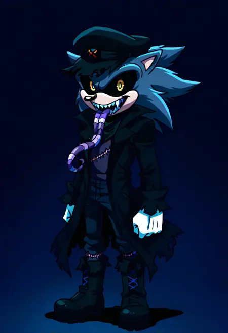 KyofuEXE, 1boy, tall, gray hedgehog, obscured in shadow, dark cap, dark tattered coat, dark tattered boots, yellow eyes with green pupils, long teeth, long tongue made out of stitches, Black sclera, colored sclera, horror