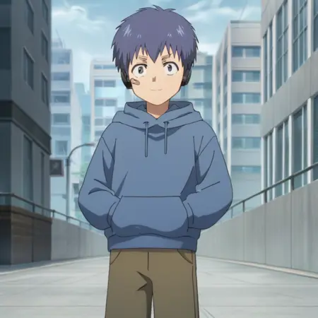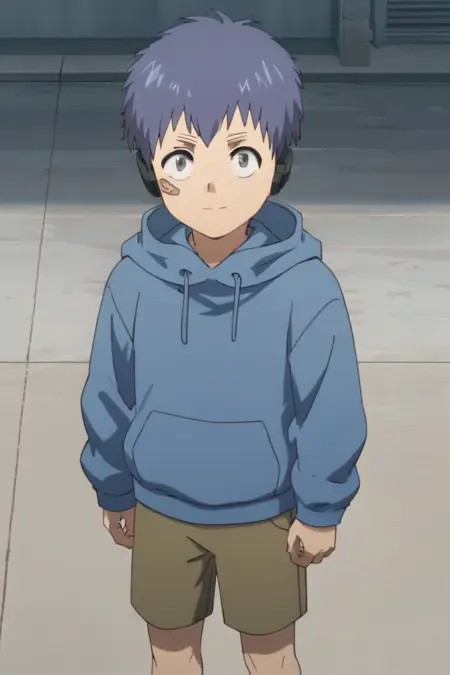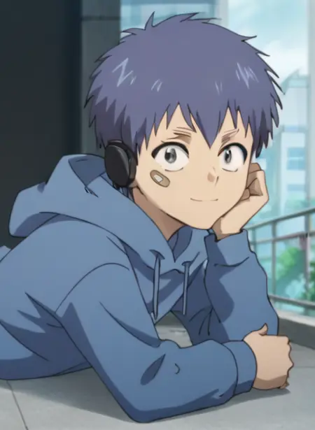 プロンプト:男性、青い髪、灰色の目、ヘッドフォン、右頬の絆創膏、青いフーディー、茶色のショートパンツ、白い靴下、青い靴、屋外(都市/路地/屋上/バス停/自然)