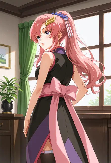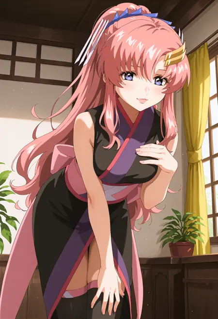 ベース: lacus_c, 1girl, アニメ風色付け, ソロ, 長髪, 高いポニーテール, ピンクの髪, 髪飾り, 髪リボン, 目の間に髪, 紫の目, リップスティック, 黒い無袖の着物, 帯, 黒いハイソックス, 中程度の胸,