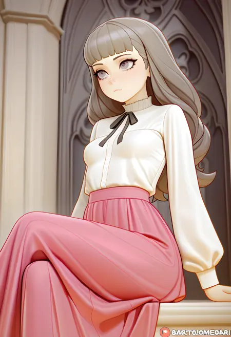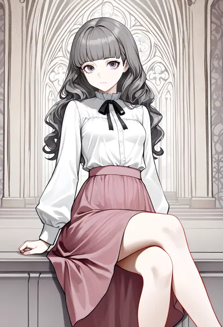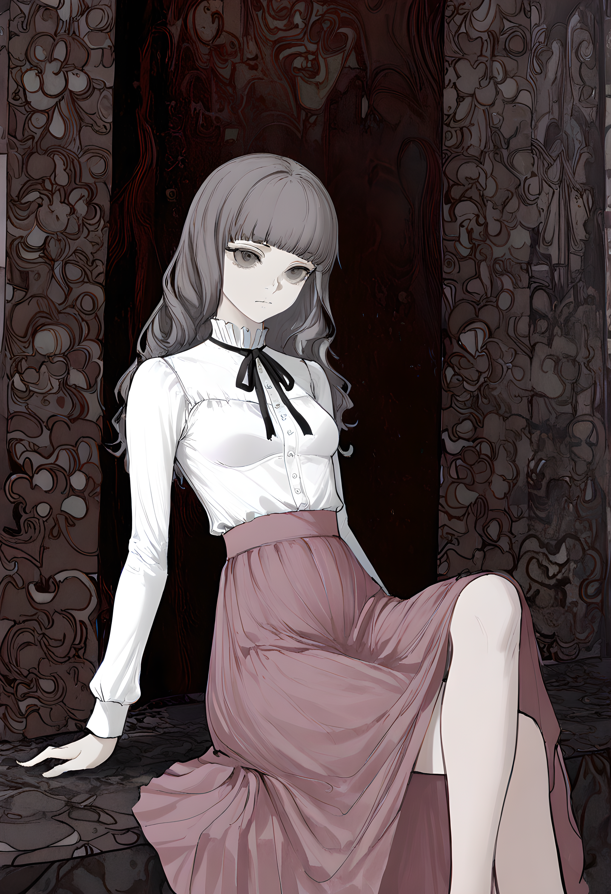 mar1na_fear, small breasts, long hair, bangs, blunt bangs, white shirt, pink skirt, long skirt, grey hair, long sleeves, black ribbon, neck ribbon,