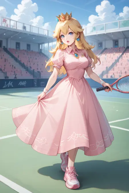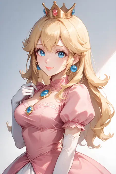 - 1girl, solo, 金发, 长发, 珠宝, 王冠, 粉色连衣裙, 耳环, 连衣裙, 蓝眼睛, 微笑, 手套, 肘部手套, 蓬松袖子, 蓬松短袖, 短袖,