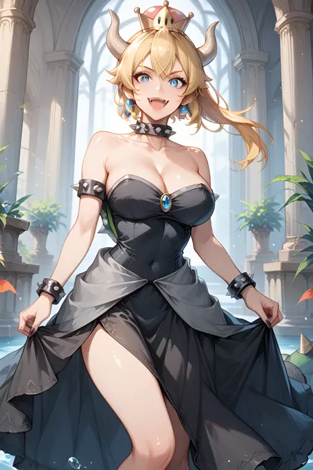 - bowsette, 1girl, 乳房, 超级王冠, 珠宝, 带刺手镯, 金发, 手镯, 王冠, 尖刺, 连衣裙, 带刺项圈, 蓝眼睛, 手叉腰, 角, 黑色连衣裙, solo, 耳环, 带刺臂环, 深V领, 项圈, 臂环, 腹部遮盖, 带刺尾巴, 望着观众, 裸露肩膀, 长发, 马尾辫, 火焰, 锁骨, 胸针