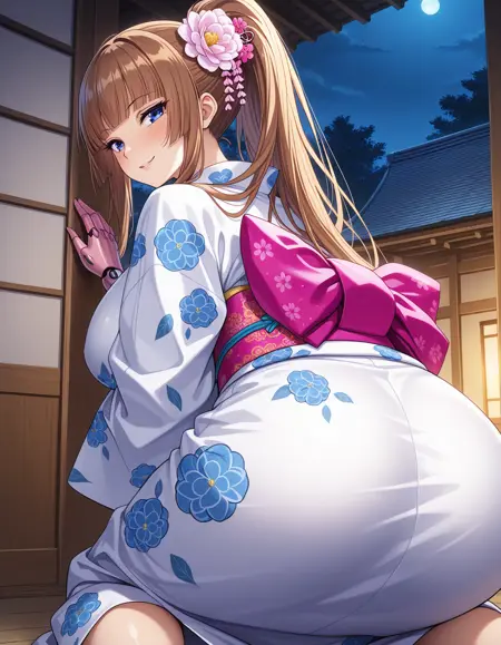 KoukawaAsukaYuk, brown hair, long hair, high ponytail, blunt bangs, blue eyes, hair ornament, hair flower white yukata, floral print, pink obi, pink mechanical arms