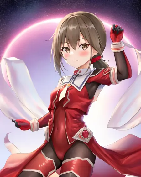 1girl, solo, brown hair, brown eyes, low ponytail, red gloves, bodysuit, red jacket, magic girl, red scrunchie, red dress, red thighhighs,