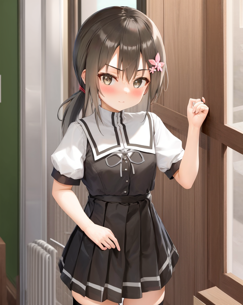 1girl, solo, brown hair, brown eyes, low ponytail, flower hair pins, hair ribbon, school uniform, striped thighhighs, white ribbon, short sleeve, black skirt,