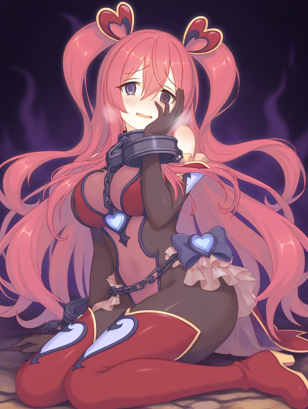 - kuka (noire) (princess connect!), 양 옆 위로 올린 머리, 옆머리, 빨간 레오파드, 빨간 부츠, 검은 바디수트,