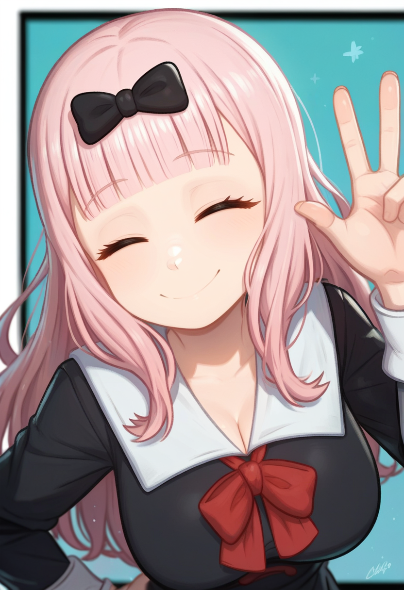 [ chika smile face, smile, closed mouth, closed eyes, w hand sign /