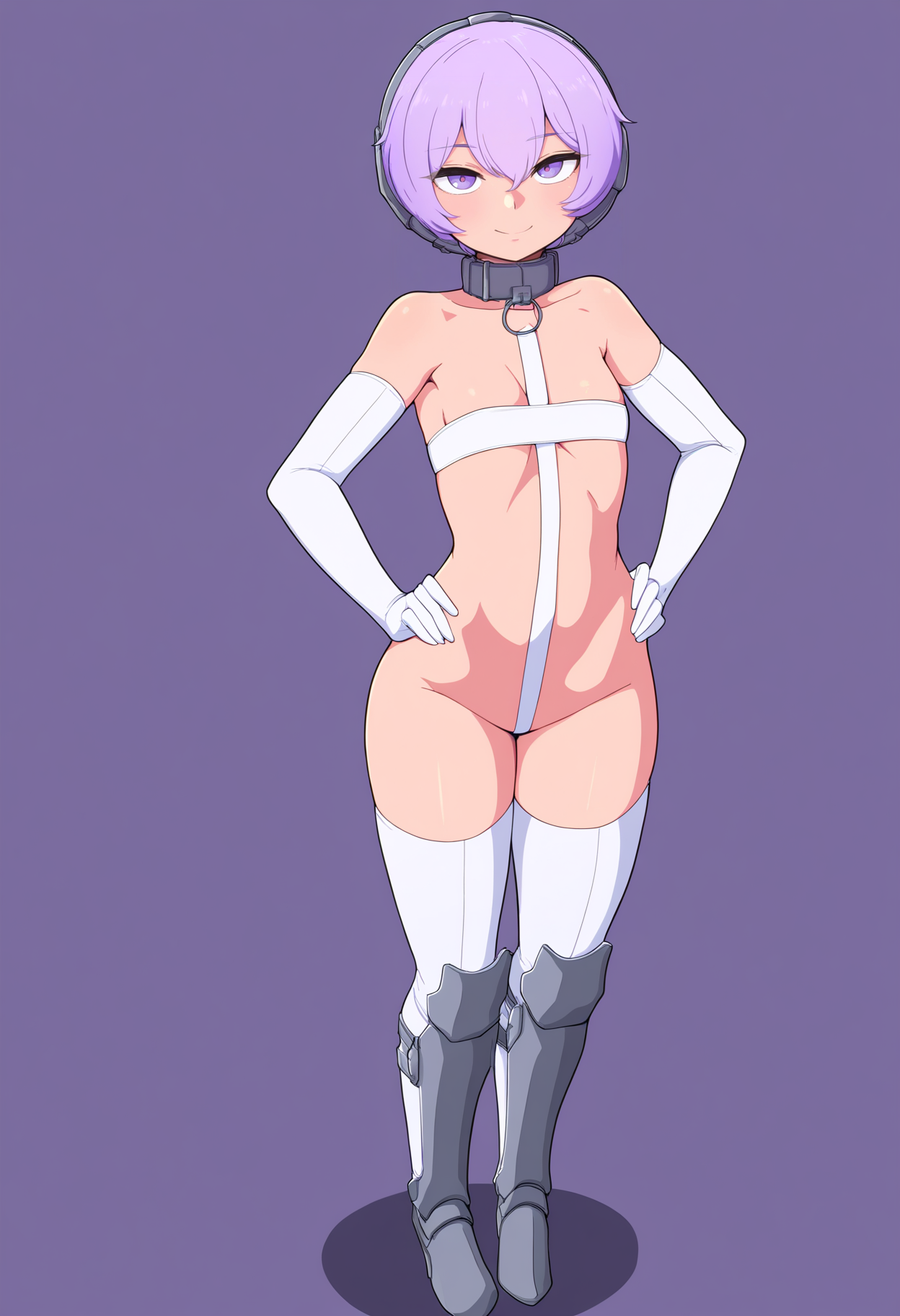 Skin suit prompts : skin suit, bare shoulders, collar, white elbow gloves, white thighhighs, boots