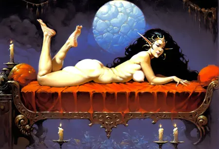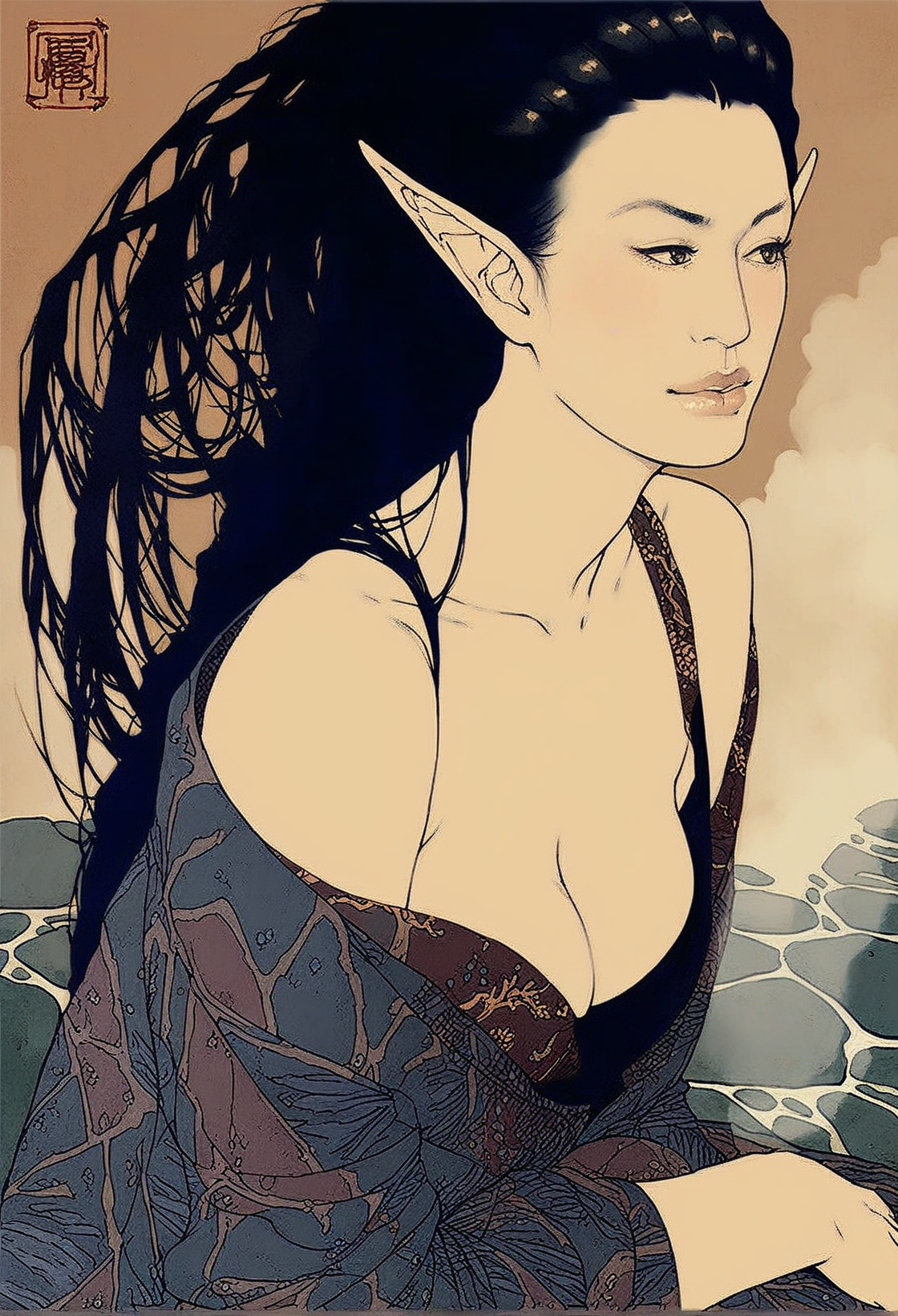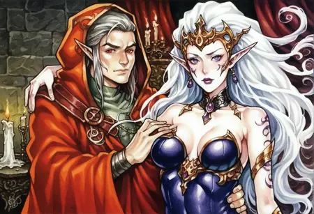 이걸 잊어버릴 뻔해서 태깅 과정 중 이미지들을 추가했다. 또 다른 마법사, 당연하지! 하지만 그녀의 복장은 매우 다르다. 레오타드를 입은 유일한 캐릭터다. 혹은 적어도 내 눈에는 그렇게 보였고, 팬아트가 그 인상을 더욱 강화했다. 전신 이미지는 없었지만, 다크 엘프 패션을 따르는 것 같아서 하이힐, 플랫폼 부츠 등을 착용했을 것이다.