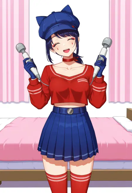 - blue shoes,blue skirt,side bangs,pleated skirt,blue gloves,red thighhighs,red sweater,low ponytail,long sleeves,red choker,