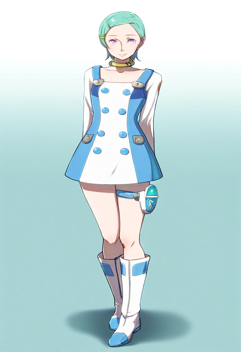 Outfit - blue dress, white dress, uniform, long sleeves, thigh strap, knee boots, white footwear