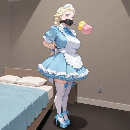 鸡毛掸子属于面板口塞风格的一部分,如果你省略鸡毛掸子,它会显著地显现出来。鸡毛掸子本身是随机生成的,若加上双臂置于背后的提示会非常有帮助,因为模型不知道该把鸡毛掸子放在哪里,只能作为口塞附件使用。成功率大约是50/50。它可能会附着在嘴部的任何物体上(仅测试过面板和球形)。这某种程度上创造了一个锚点(如口交、手指吮吸等)。