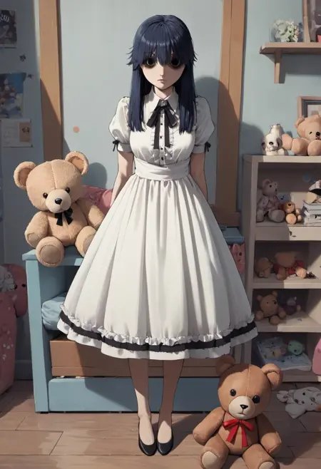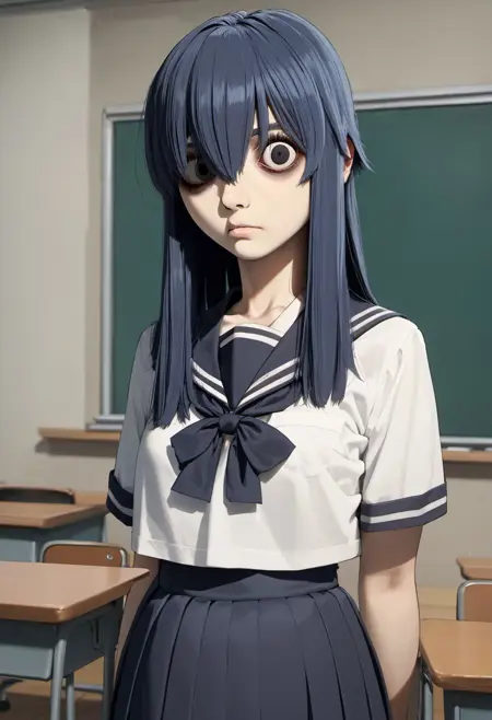 : creepy mita, 긴 머리, 보라색 파란 머리, 검은 눈