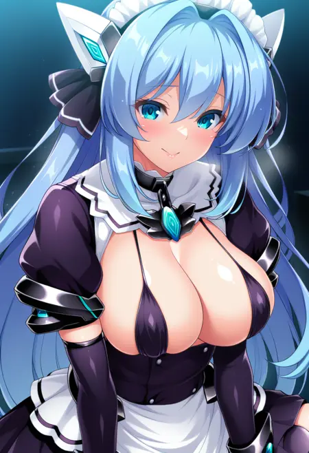 - marina, exstia 메이드 복장, 파란 머리, 청록색 눈